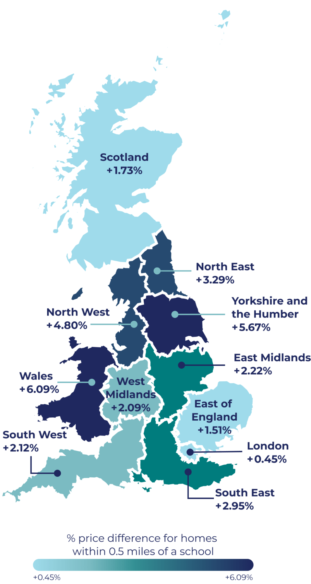 Note. The chart illustrates that proximity to a school generally increases property values across Great Britain (GB) regions, with Wales (+6.09%) and Yorkshire and the Humber (+5.67%) seeing the largest positive premiums.