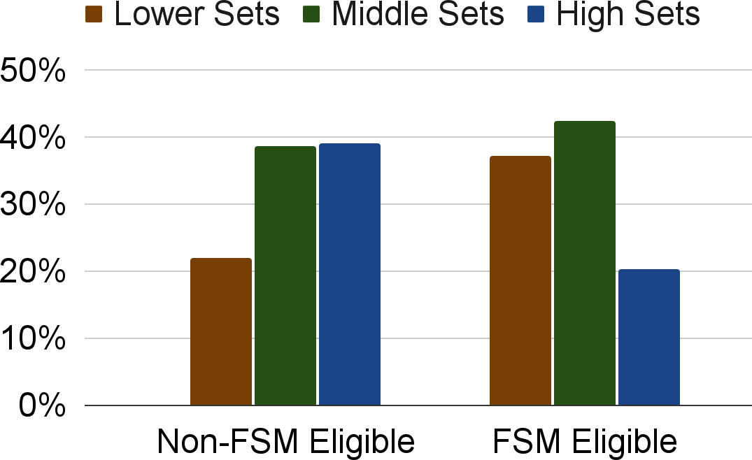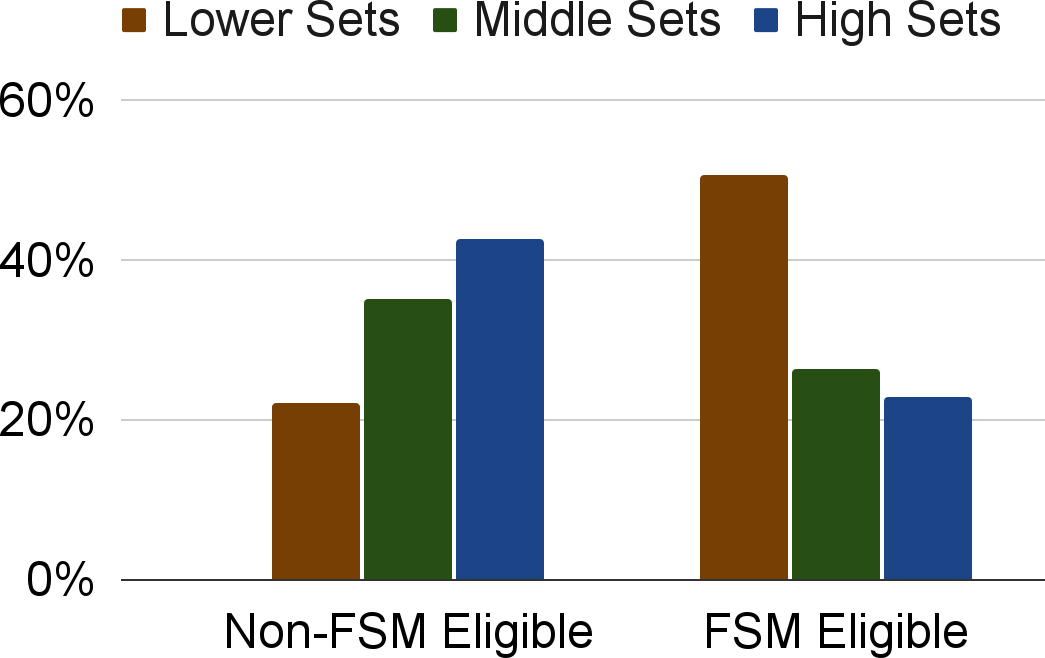 Secondly, some would-be private pupils enter or switch to the state school sector. Within this diverse and enlarging education sector, the marginal consumers - parents who just miss the private sector - likely compete for other schools. Those aiming for selective grammar schools may redistribute resources to entrance exam preparation, e.g. 11+ assessment tutoring. Those aiming for high-performing comprehensives look for desired catchment areas (or less willing to sell up if already owning). This drives up demand for certain postcodes and contributes to the gentrification of some areas. For high-achieving state schools, competition for places becomes stronger, even if this so-called competition now lies in tests or residential real estate. Within state schools themselves, the divide between those eligible for Free School Meals (FSM) and those ineligible is stark in the distribution of pupils in sets (Dunne et al., 2007). In both secondary and primary state schools, FSM-eligible students are more likely placed in low sets than their non-FSM-eligible counterparts (Figure 4). Those switching from private to state schools are almost certainly non-FSM-eligible. The resources and achievement-oriented culture they possess in comparison to the rest of the state school population place them in higher sets for scholastic achievement. As the pupil population increases, more teachers are required to teach them, and to some degree the 6,500 new teacher recruits announced by the government will merely address the sectorʼs churn. Without targeted resources (save contextual measures from elite universities to ʻreachʼ out to ʻtalentsʼ), socioeconomic mobility is set to worsen.