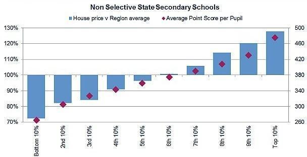 Note. This chart shows a clear correlation in the UK housing market: houses located near higher-performing non-selective state schools command a significant price premium over the regional average. The better a school’s academic results (as measured by point score), the higher the extra cost for nearby property. The “Top 10%” of schools are associated with the highest house price premiums.